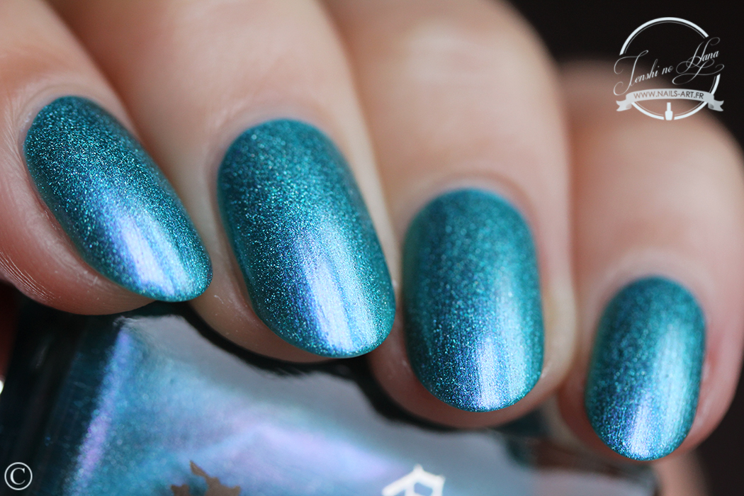 Whispering Waves est un vrai bleu des mers du sud, oscillant entre le bleu céleste et le turquoise. Son fini de base est assez métallisé, et il possède également cette poudre holographique si typique de la marque. Mais le plus dingue dans Whispering Waves, je crois que c’est ce reflet violet qui vient subtilement donner une dimension en plus au vernis. Ce reflet est, comme toujours, bien plus présent dans le flacon que sur les ongles, mais on le voit bel et bien une fois porté.