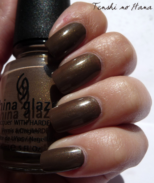 I told you earlier about it being a taupe, I would rather now call it a brownish-taupe. It reminds me of milk chocolate, a yummy colour filled with golden glitter!