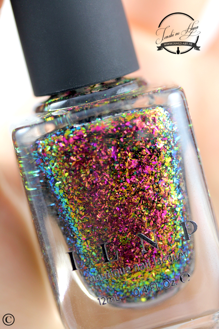 Comme je vous l’avais dit, il y a quelques temps, j’ai craqué pour quelques ILNP dans la Pshiiit-Boutique. Celui que je m’apprête à vous présenter fait partie de la collection Ultra Chrome Flakies, une collection de 13 vernis composés de flakies multichromes de folie, autant vous dire de suite que le choix fut cornélien. J’ai craqué pour 2 vernis de la collection et le premier que je vous propose de découvrir est Electric Carnival, l’un de ceux qui a eu le plus de succès car ses reflets sont complètement ahurissants ! Non mais regardez-moi cette merveille !