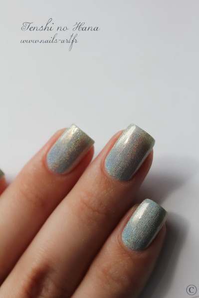 Mes photos ne rendent clairement pas justice à ce vernis et à ses reflets tout aussi holographiques que les précédents, mais le soleil faisait une partie de cache-cache avec les nuages…