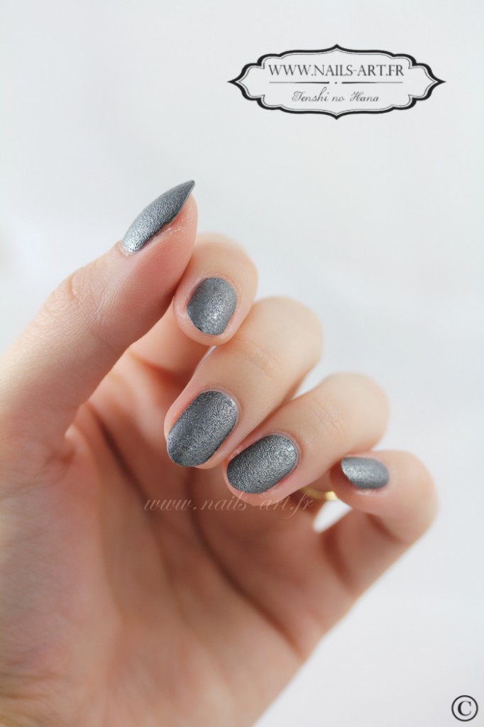 Moonstone est un vernis gris anthracite, nacré dans le flacon, mais quand on le pose il n’a plus rien à voir. Il s’agit en réalité d’un vernis texturé, mais Moonstone, contrairement à la quasi totalité des vernis texturés, n’est pas matte, il conserve ce fini nacré, limite métallisé malgré la texture. Je vous avais dit que Moonstone était remarquable ! Le rendu est effectivement lunaire, il me fait penser à une roche intergalactique. Le fini est indéniablement original et surprendra les plus NPA d’entre nous !