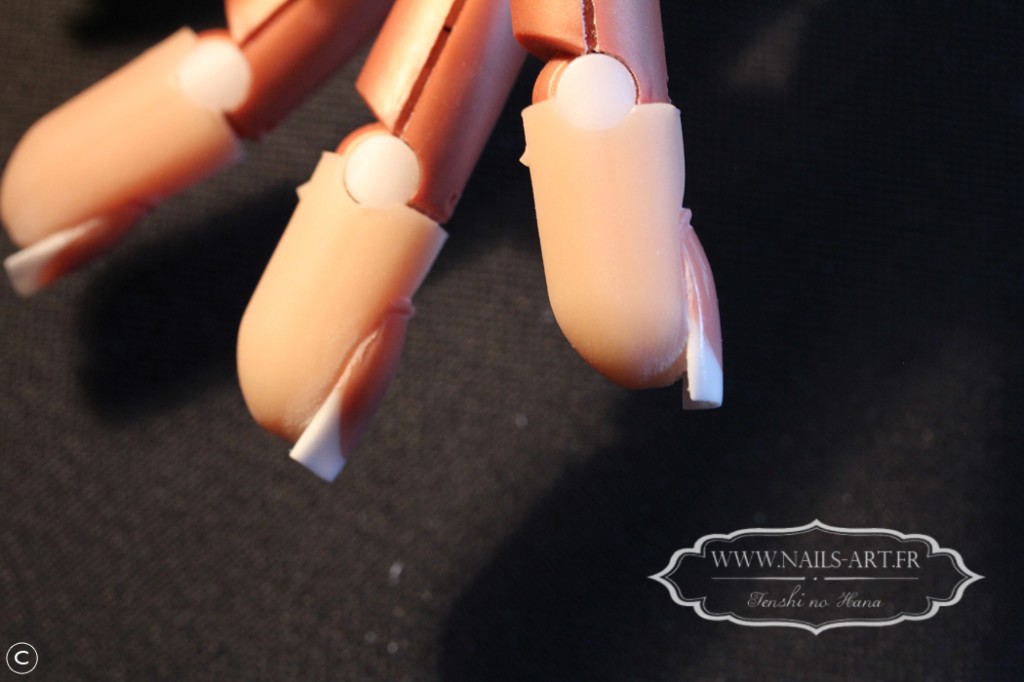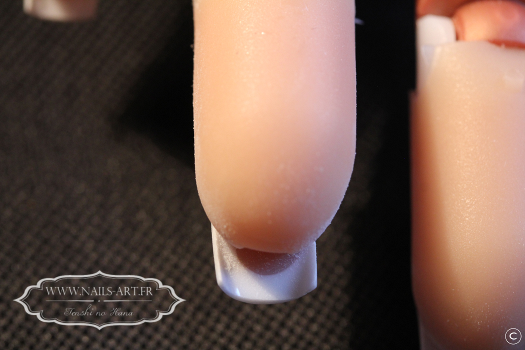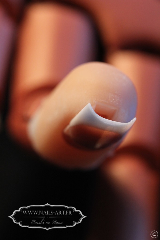 Pour vous expliquer un peu ma galère, j’ai entrepris de rabaisser la matière uniquement au niveau de ma french pour ne laisser qu’une très très fine épaisseur de résine transparente et la remplir ensuite de blanc….Tout ça…à la lime ! Oui oui vous avez bien lu, j’ai commencé par faire une encoche au niveau de ma french, avec l’arrête de ma lime, le plus près possible du bord de ma cover, mais pas trop près non plus pour ne pas ensuite devoir la raccourcir de trop…Puis avec la lime fine placée perpendiculairement à l’ongle, j’ai recréé ma corniche au niveau de ma cover…Tout en essayant de laisser une très très fine couche de résine au niveau de ma french mais sans faire de trous pour ne pas devoir replacer de chablons ! Autant vous le dire de suite, ce fut long…et ch**** ! J’ai fait quelques trous, j’ai donc du replacer exactement 3 chablons…mais grosso modo ça s’est plutôt bien placé…