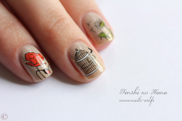 For this nail art I simply applied Sand Tropez by Essie for base, then I make a gradient with sponge with the Gold as it Gets (Essie again, and I thank so much Amélie who offered me this polish, it was a real surprise! I plan to apply it on a nail polish soon, you will see it is a jewel!) on the tip of my nail to give a touch of brightness. Finally I simply applied the water decals.