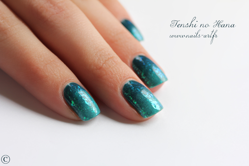 It is a simple gradient of seagreen on which I applied the sublime Maisie by Zoya, one of the 3 new flakies from the Fleck Effects collection. Reflections go from the indigo blue to the seagreen. Photos do not show the real beauty of the polish.